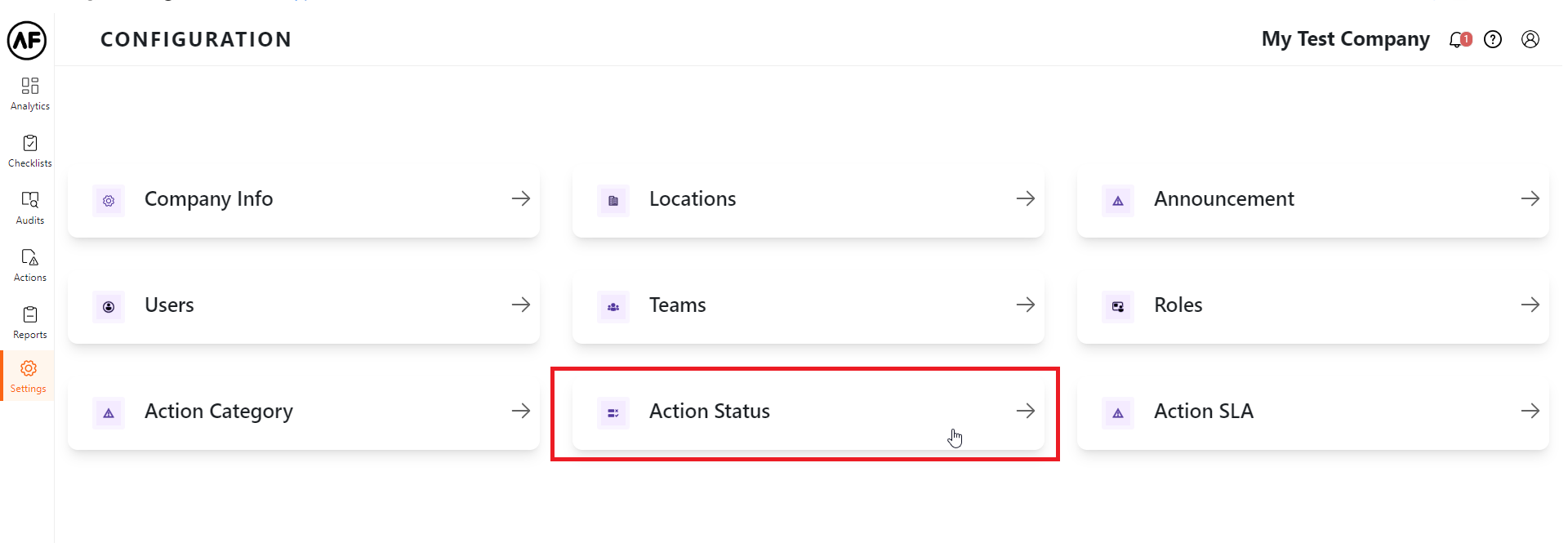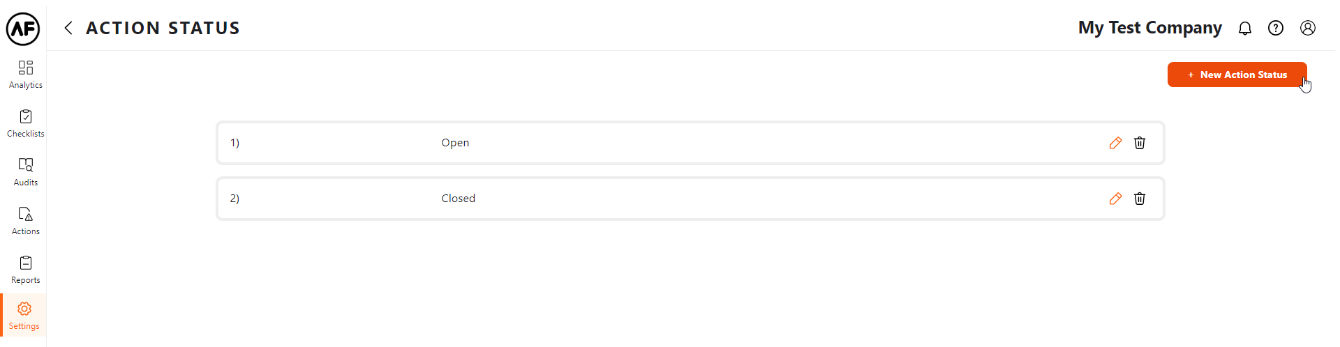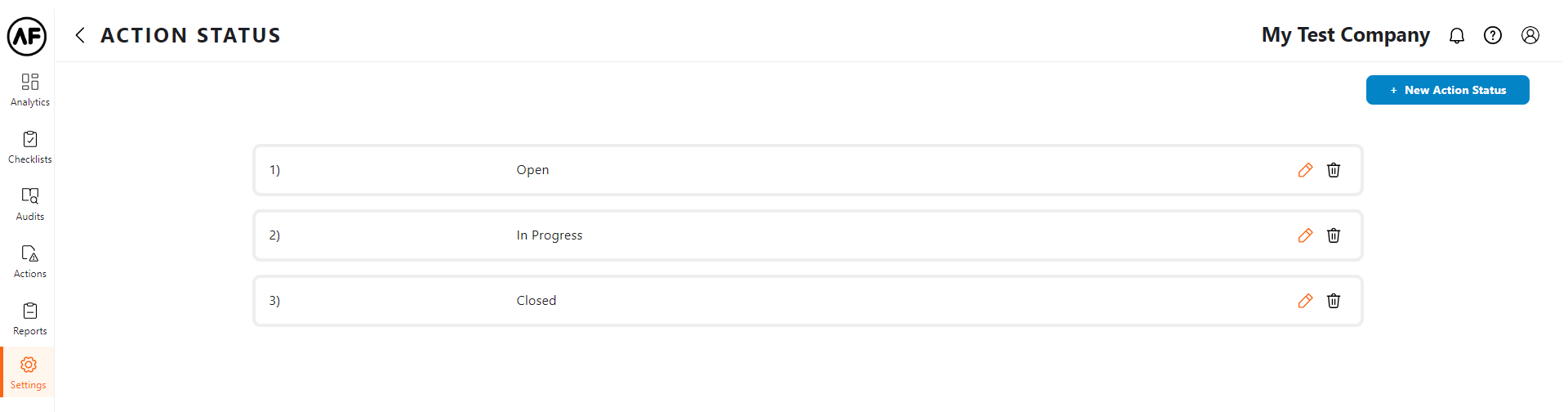 To check the available Action Status options, click on Settings in the left navigation bar and select the Action Status tab.