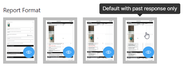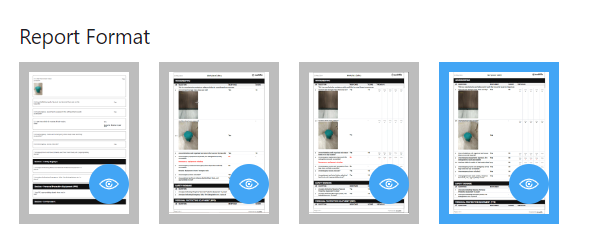 There are 4 available formats. Hover over each card to know the format name, and click on the eye icon to expand the desired format. This will display a sample image of the report having that format.