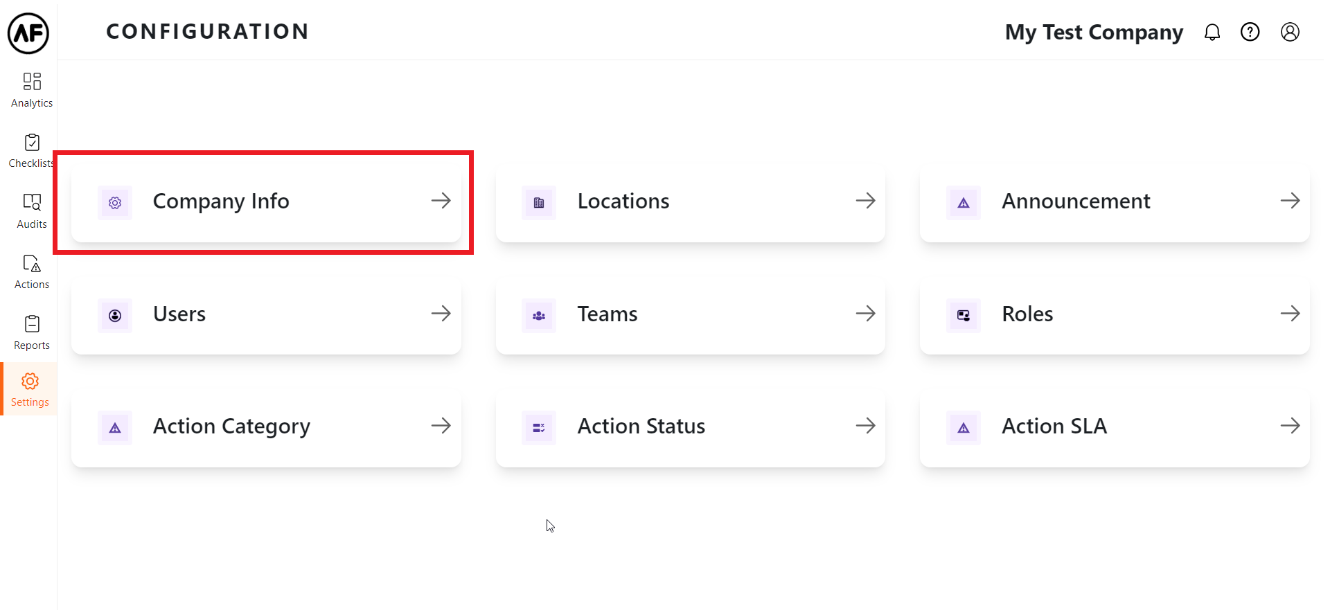Click on the Settings tab at the left navigation pane of your Auditflo screen, and select the Company Info tab shown below.