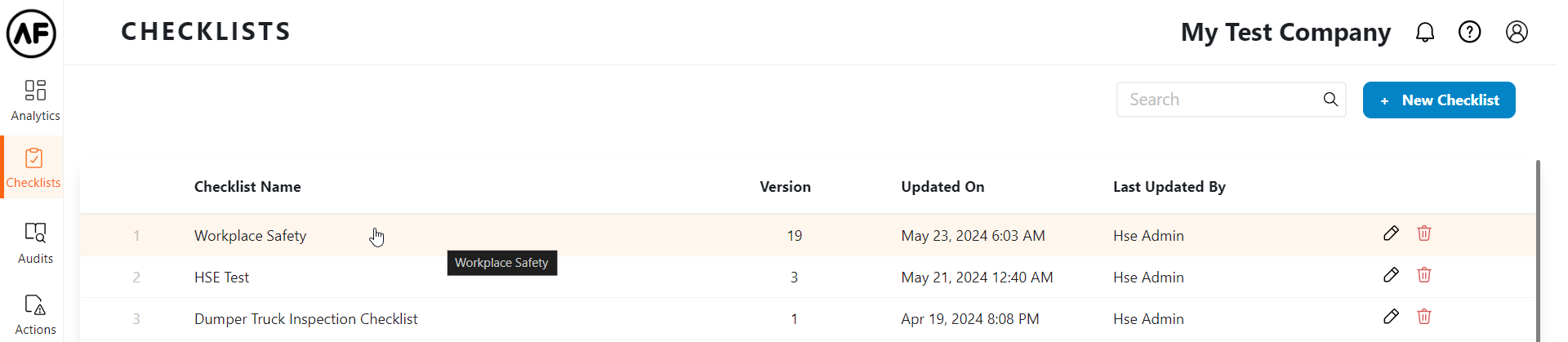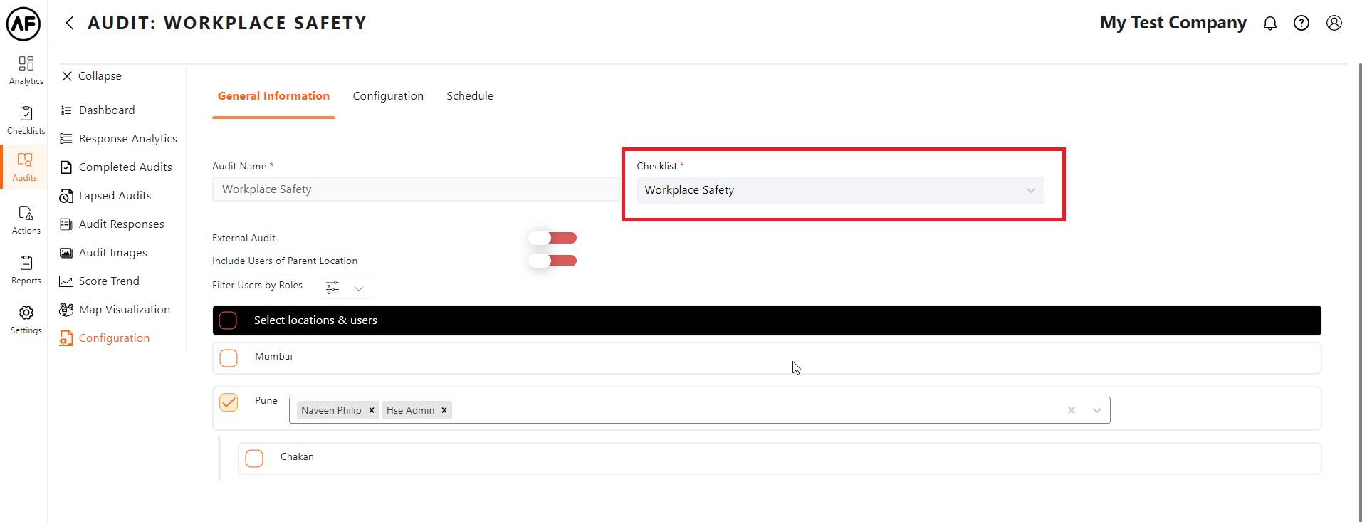 First, go to the page of the desired audit (from list of Audits which is accessible from the left navigation bar on your screen). E.g., Workplace Safety audit.