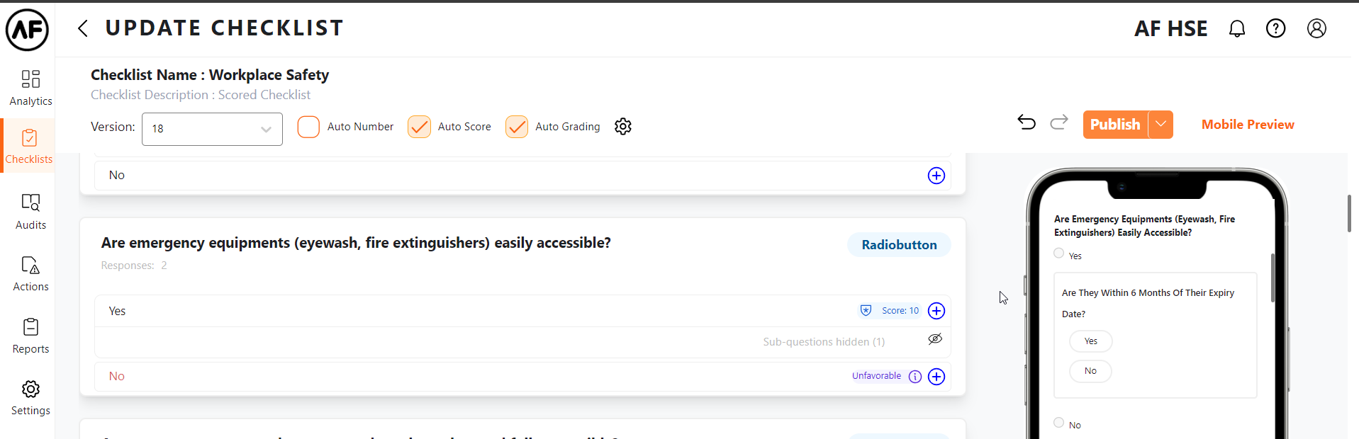 Now, when the user performs the audit, and if they choose the response that has been flagged as Unfavourable while creating the checklist, then the Action associated with that response will be created automatically by the system, and will be visible to users depending on their Role permissions.