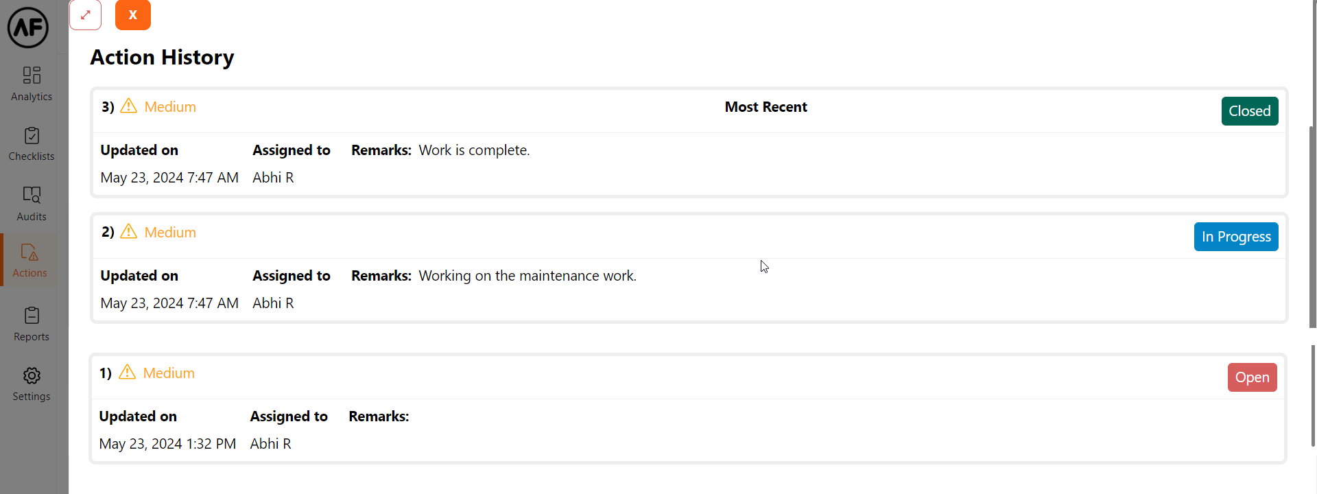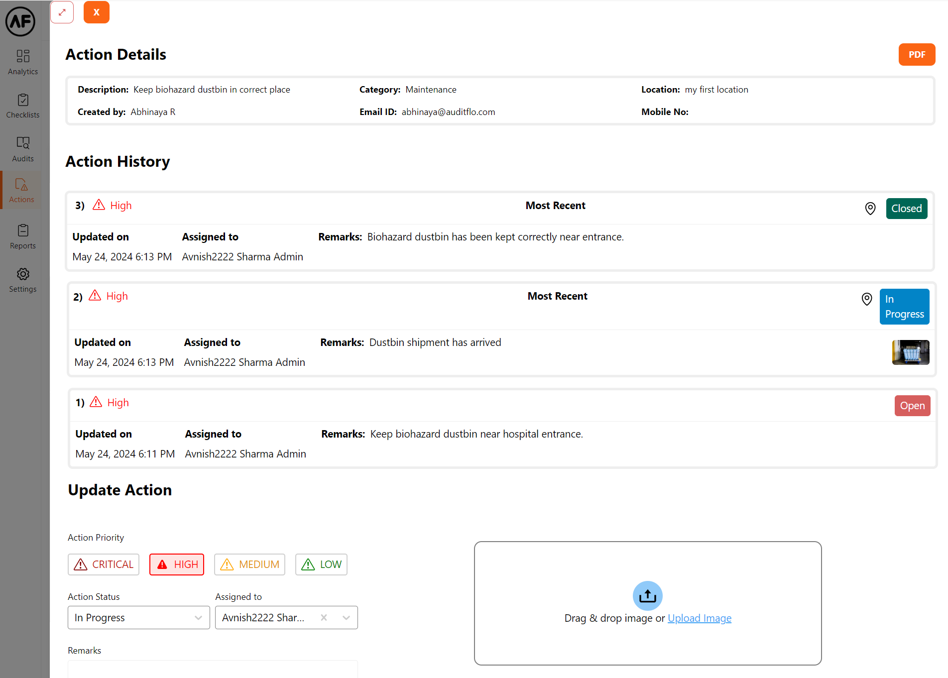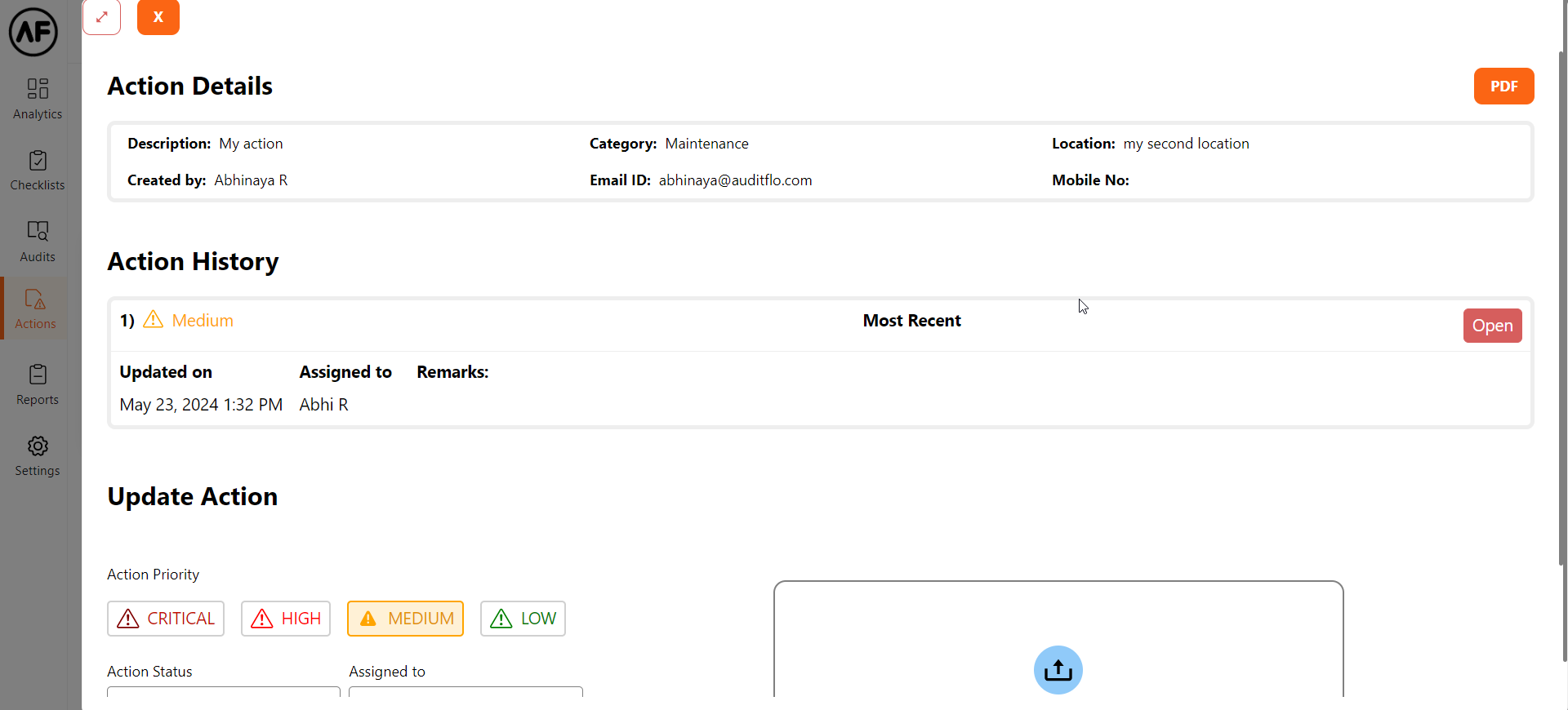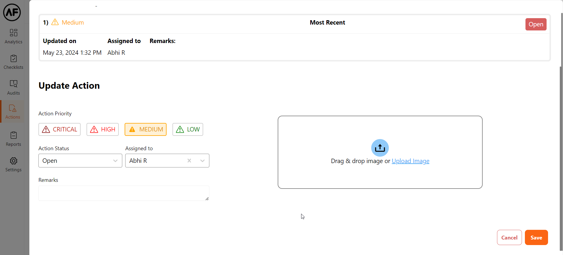 Furthermore, the action can be assigned to a different user. Remarks can be added if required. Images can be attached as proof of task progress/completion.