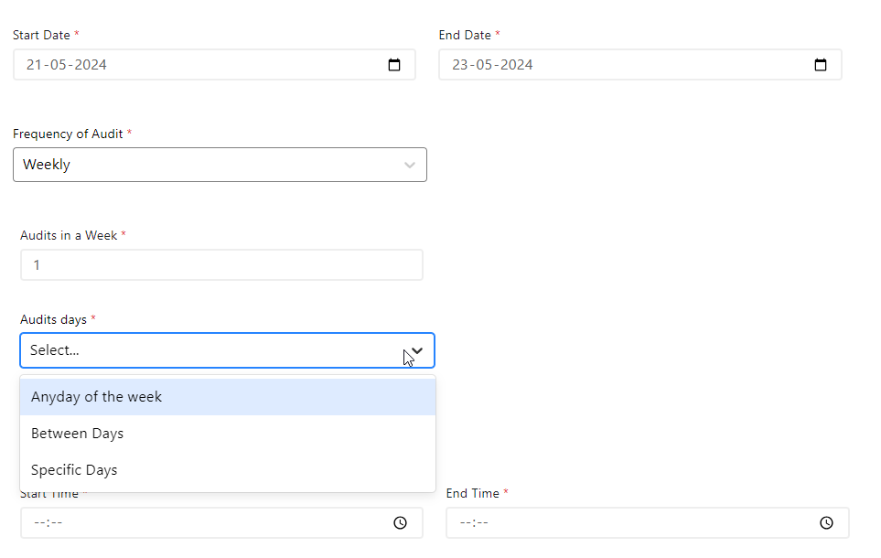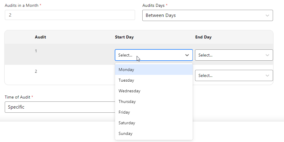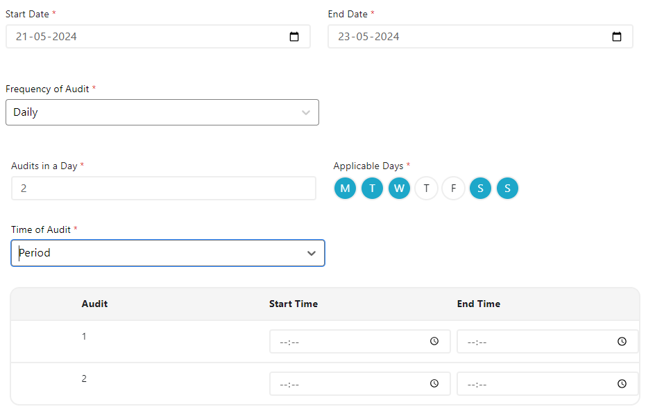 Here, you can specify the number of audits in a day, and the different days of the week when the audit is supposed to be filled. Click on the desired day initials (M is for Monday, T is for Tuesday, and so on) to select them.