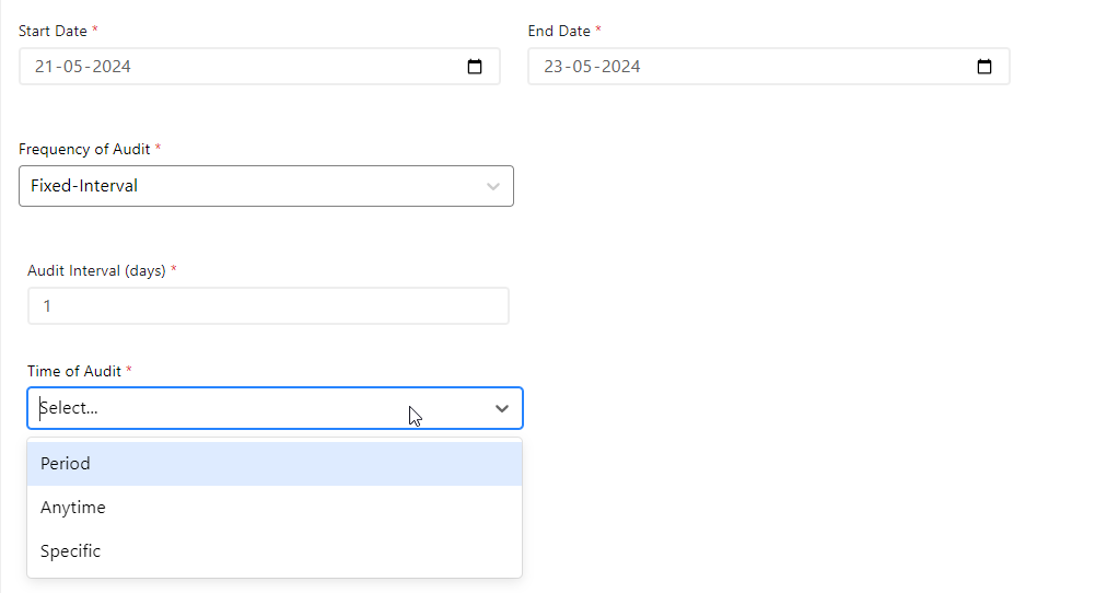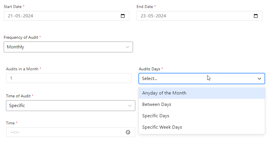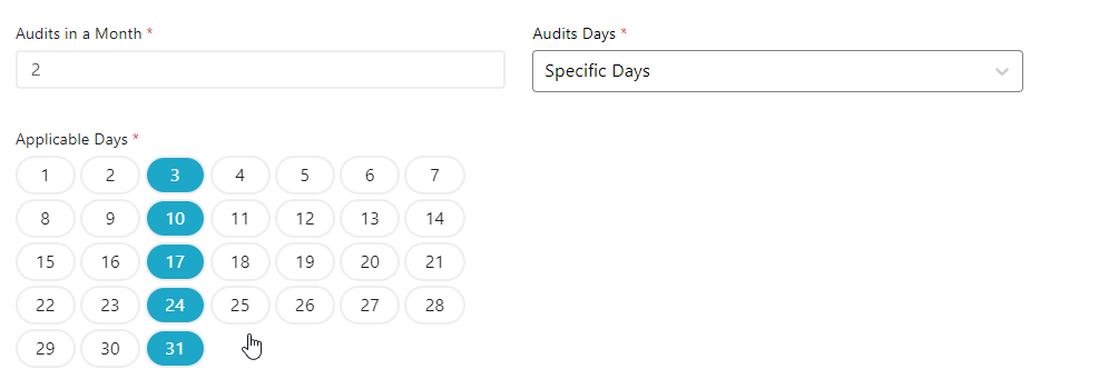 Specific Days—Select the specific dates of the month (between 1st to 31st, as applicable for that month) when you want the audit to be performed, by clicking on the date numbers.