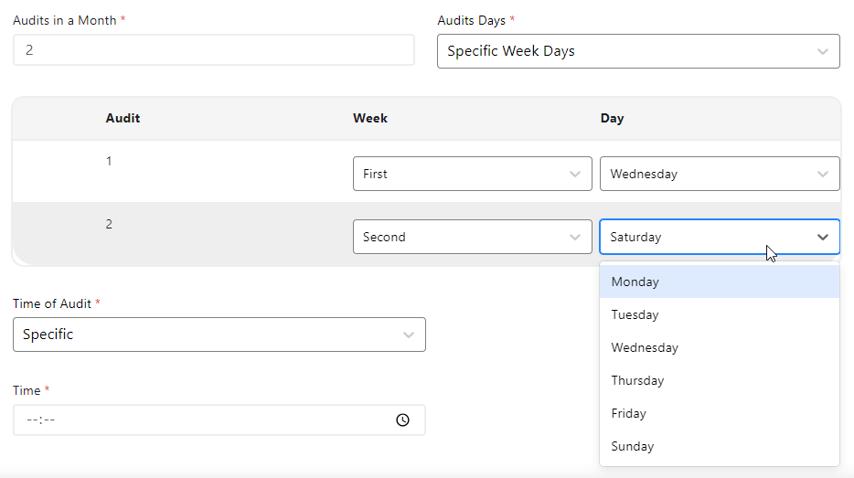 Specific weekdays—Select which week of the month and on which day each audit should be performed. E.g., You can set an audit to be performed in the first week of each month on Wednesday. You can also set an audit to be performed in any week of the month but on a specific day.